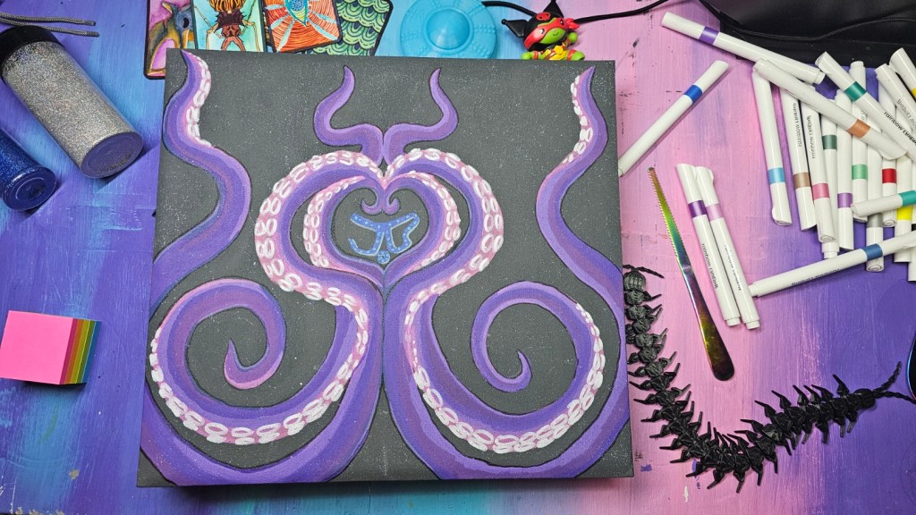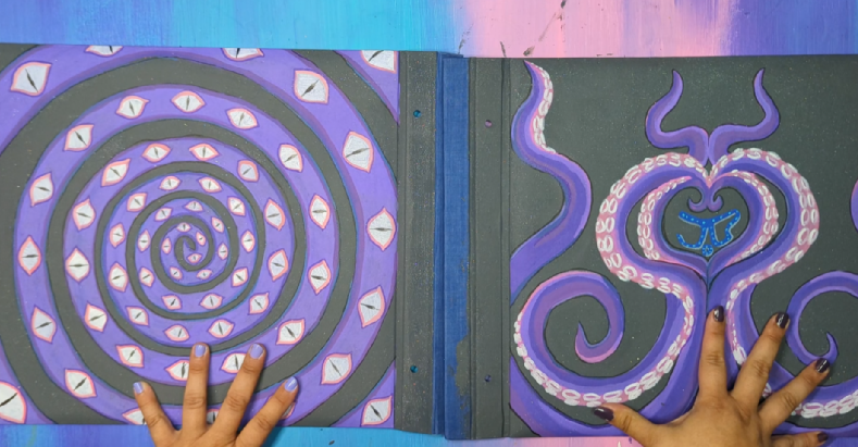 I set out to find the longest Chicago screws available to me and embarked upon creating this junk journal abomination using especially sturdy heavyweight cardstock. I wish I had taken a before photograph of the original generic blue polka dot design, but I was far too excited to execute this brilliant idea that I was surely the first person to ever think of. Because tentacles are some of my favorite things to draw, the covers naturally had to feature them: