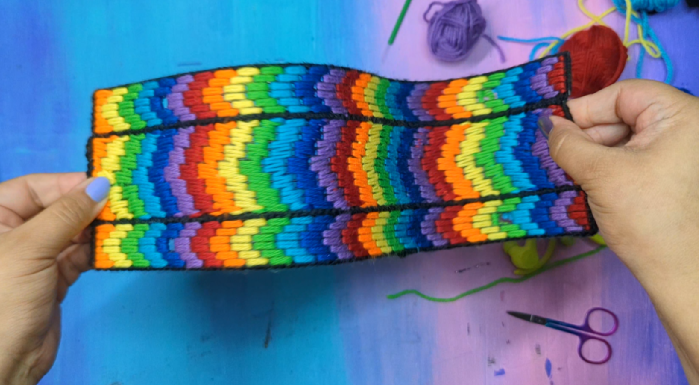 I had previously experimented with embroidered spines for my sketchbooks, and the screw-style spine made this part effortless. I sewed three panels of 7 count canvas mesh together and embroidered a super easy rainbow design. “Installing” the spine was easy as snipping a gap in the mesh for the two Chicago screws and adding the spine on, like putting paper in a binder.